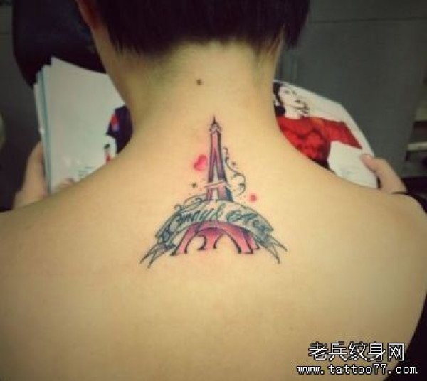 女生背部一张彩色埃菲尔铁塔纹身图案