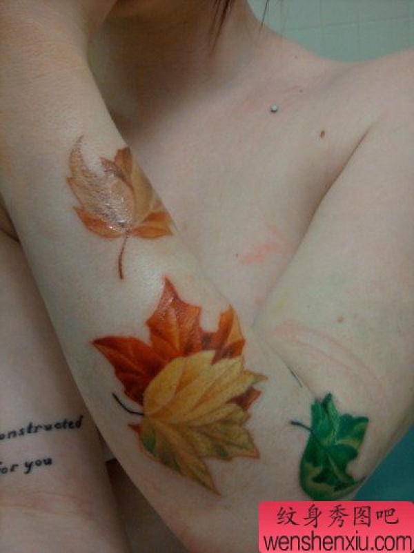 女孩子手臂漂亮的彩色枫叶纹身图案