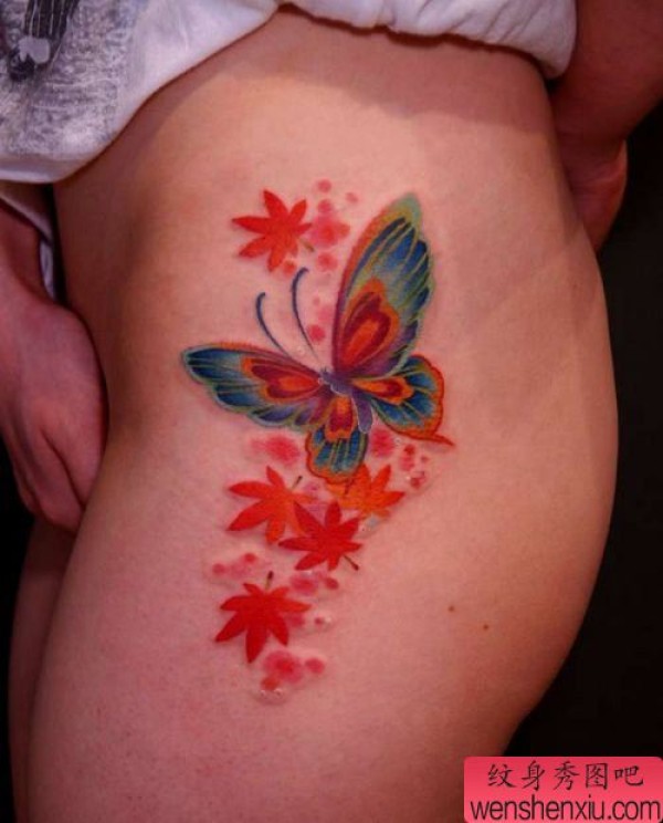 一张美女腿部漂亮的彩色蝴蝶枫叶纹身图案