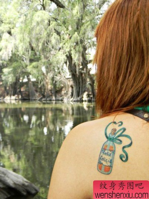 女孩子肩背一张漂流瓶纹身图案
