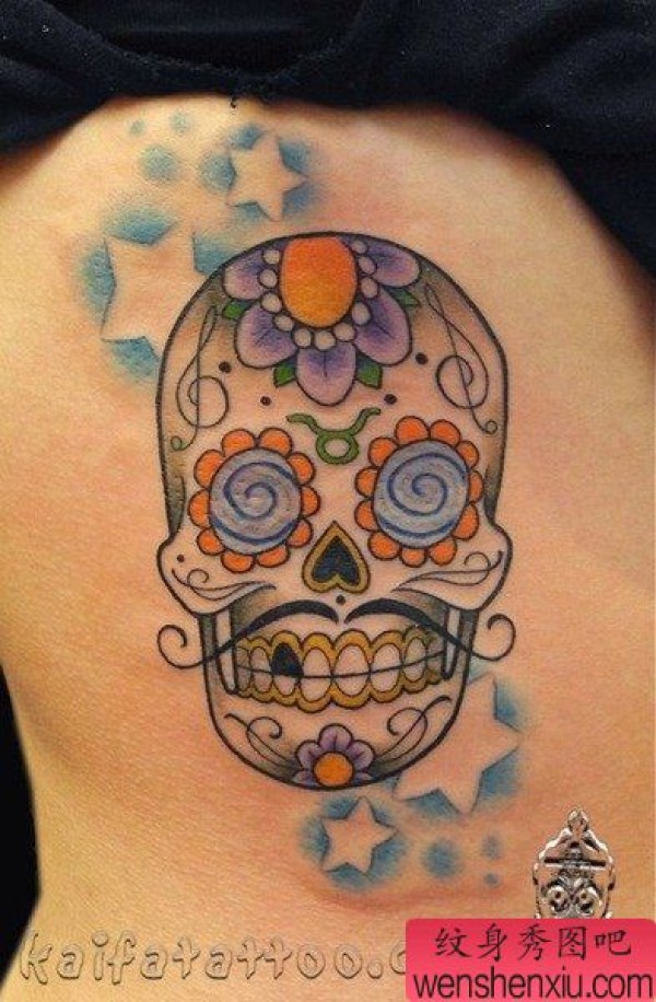 侧腰一张唯美的欧美风格骷髅纹身图案