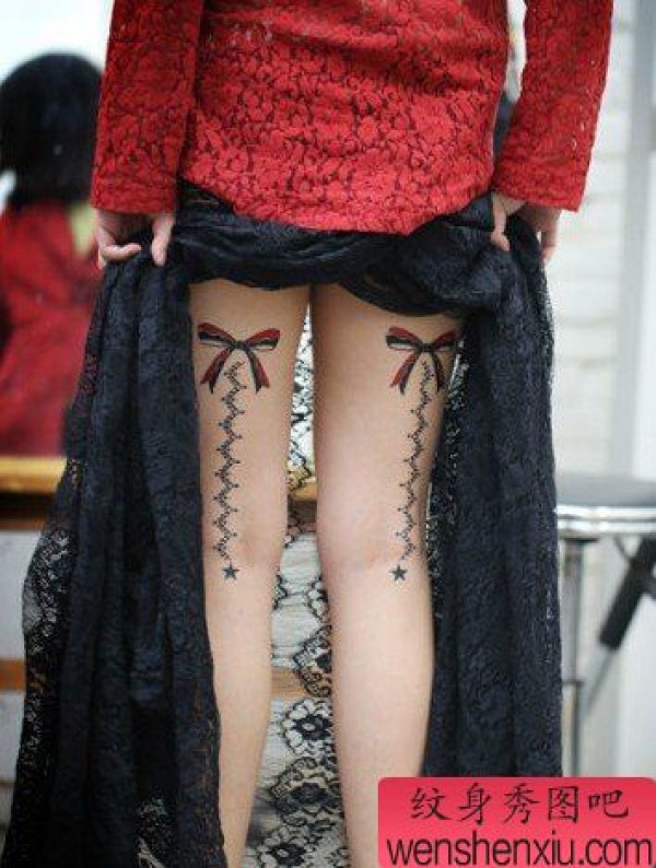 美女腿部漂亮的蝴蝶结与蕾丝纹身图案