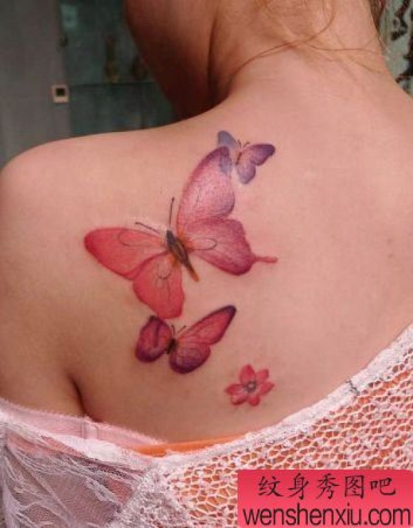 美女背部好看的彩色蝴蝶纹身图案