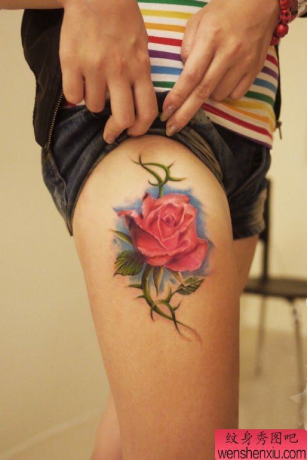 美女腿部漂亮的彩色玫瑰花纹身图案