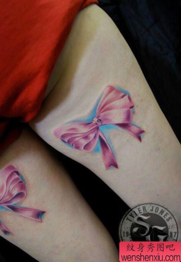美女腿部漂亮的彩色蝴蝶结纹身图案