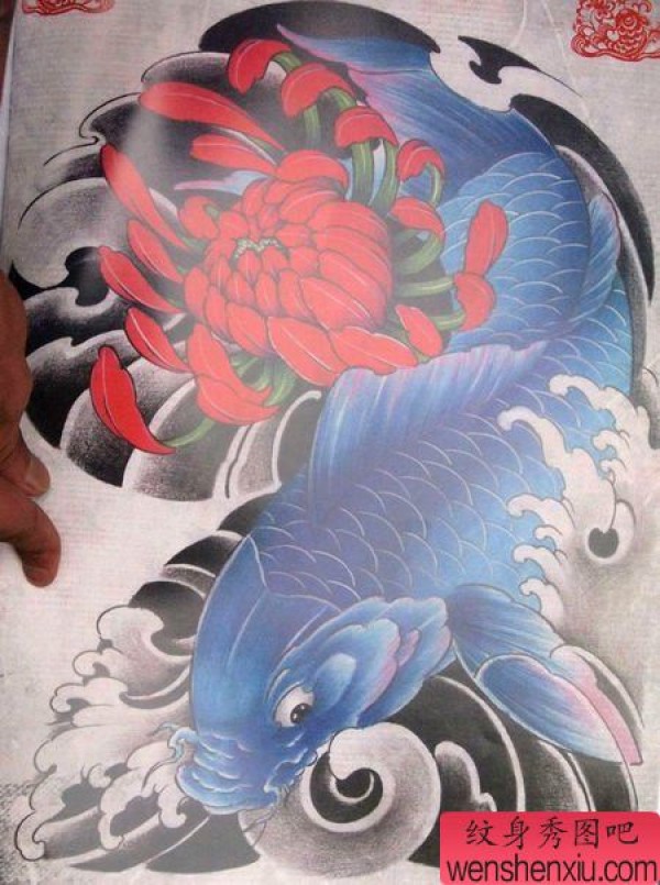 好看的鲤鱼莲花半胛纹身图案