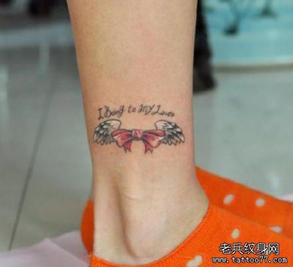 女孩子腿部小巧的蝴蝶结与翅膀纹身图案