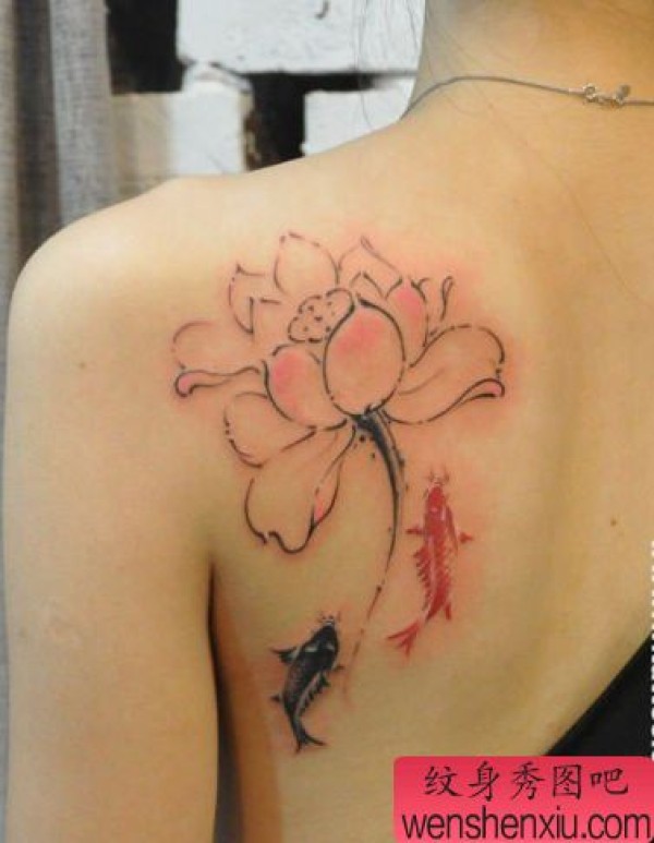 女生肩背好看时尚的水墨画莲花鲤鱼纹身图案