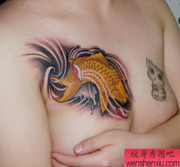 美女胸部彩色小鲤鱼纹身图案