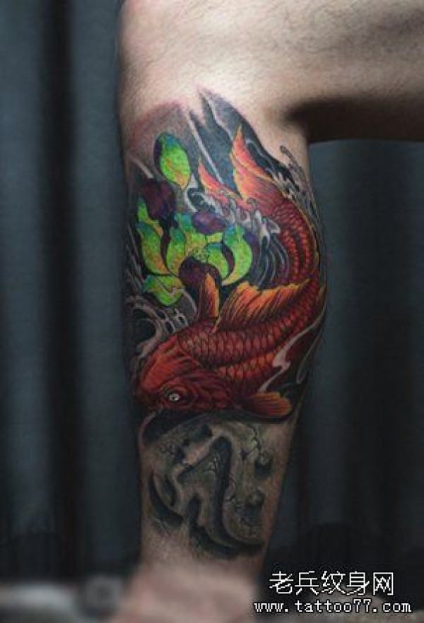 男士腿部漂亮的彩色鲤鱼莲花纹身图案