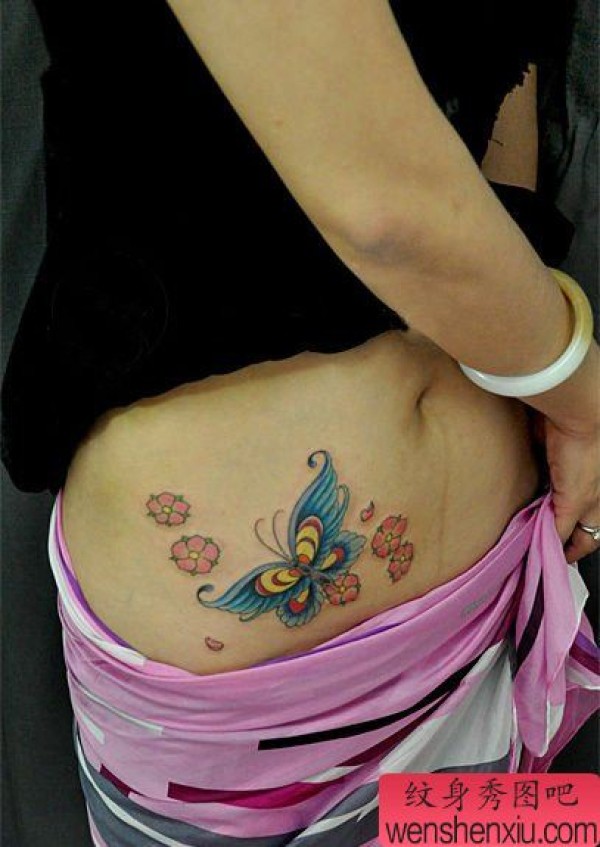 美女腹部漂亮的彩色蝴蝶与樱花纹身图案
