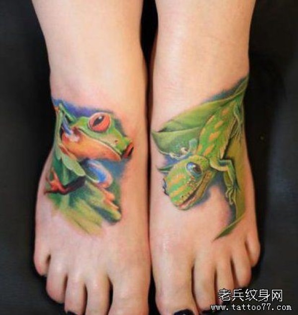 女生脚背3D彩色青蛙与壁虎纹身图案