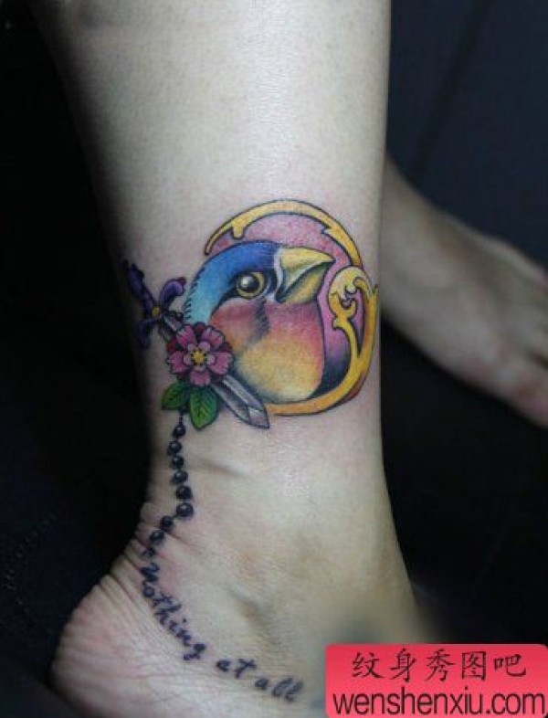 女生腿部好看的彩色小鸟纹身图案