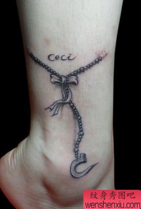 女生腿部小巧的蝴蝶结与吊链纹身图案