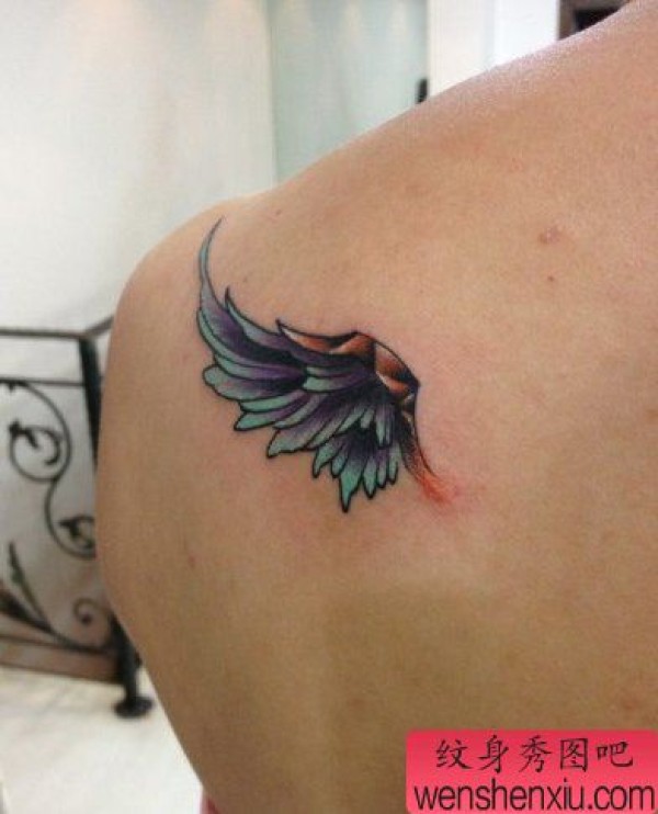 肩背小巧的彩色翅膀纹身图案