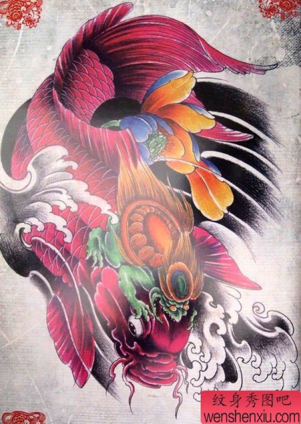 一张漂亮的紫红色鲤鱼纹身图案