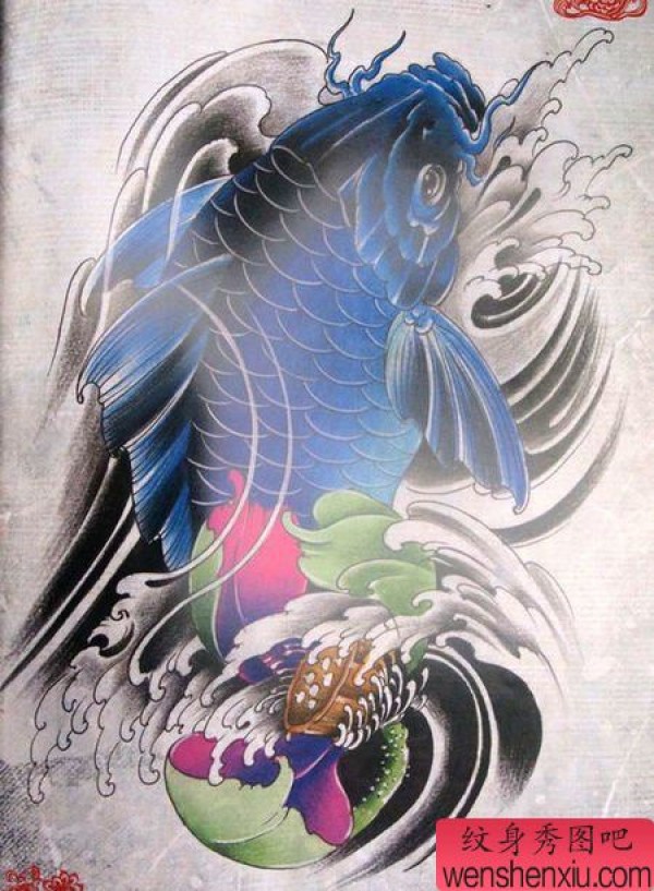 好看的蓝色鲤鱼与莲花纹身图案