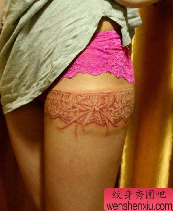 美女腿部漂亮唯美的蝴蝶结蕾丝纹身图案