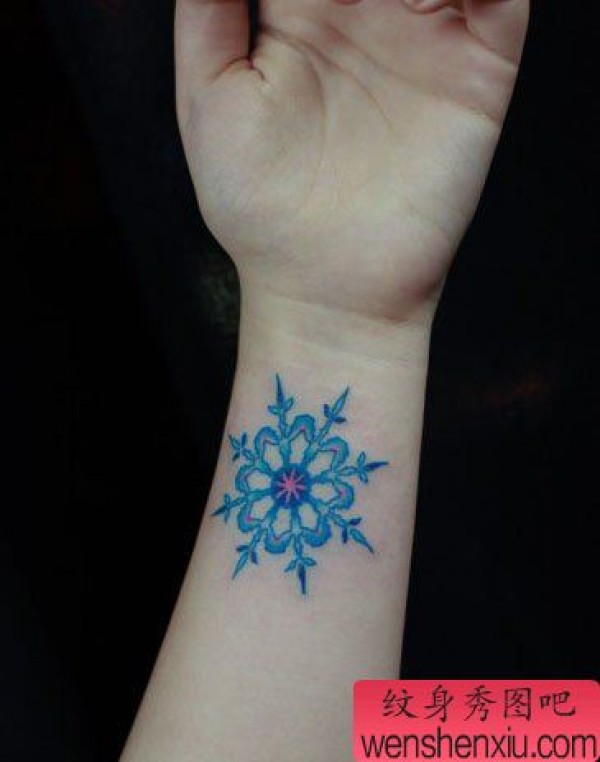 女生手腕处漂亮的彩色雪花纹身图案