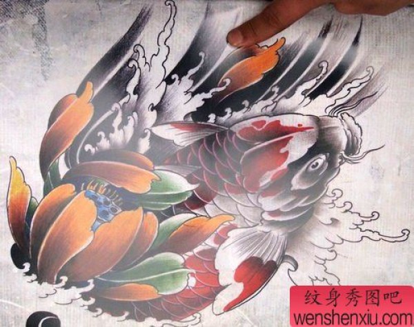 漂亮的彩色荷花与鲤鱼纹身手稿