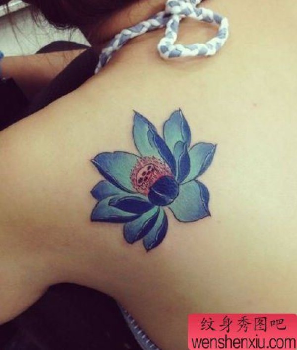 美女肩背好看的彩色莲花纹身图案
