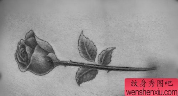 美女腹部疤痕遮盖黑灰玫瑰花纹身图案