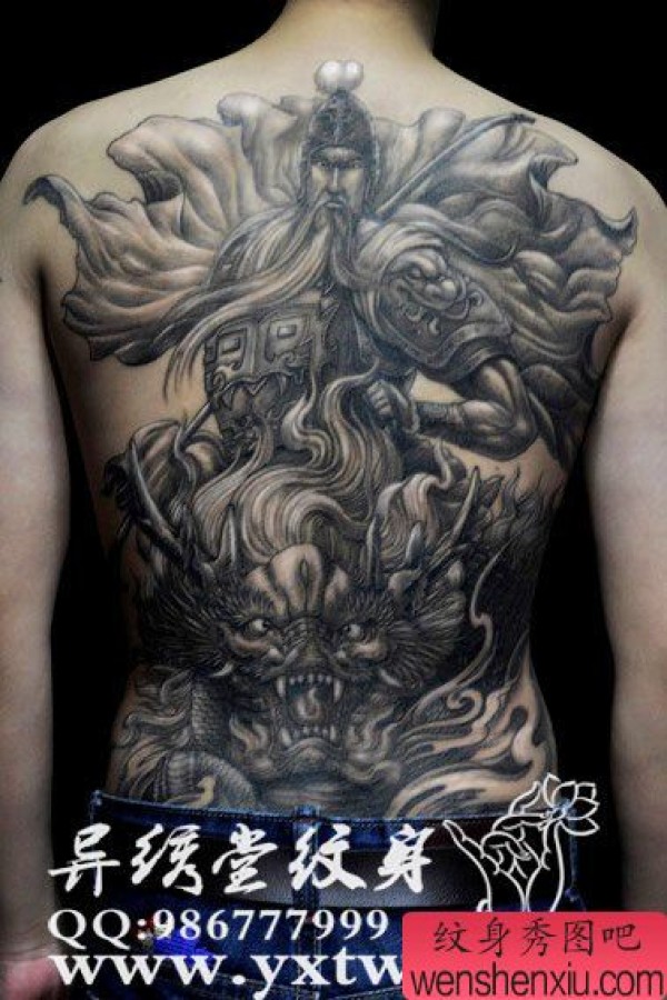 超酷的满背关公骑龙纹身图案