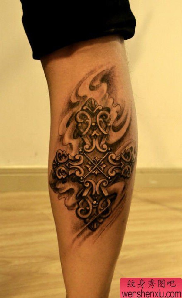 腿部好看经典的十字架纹身图案
