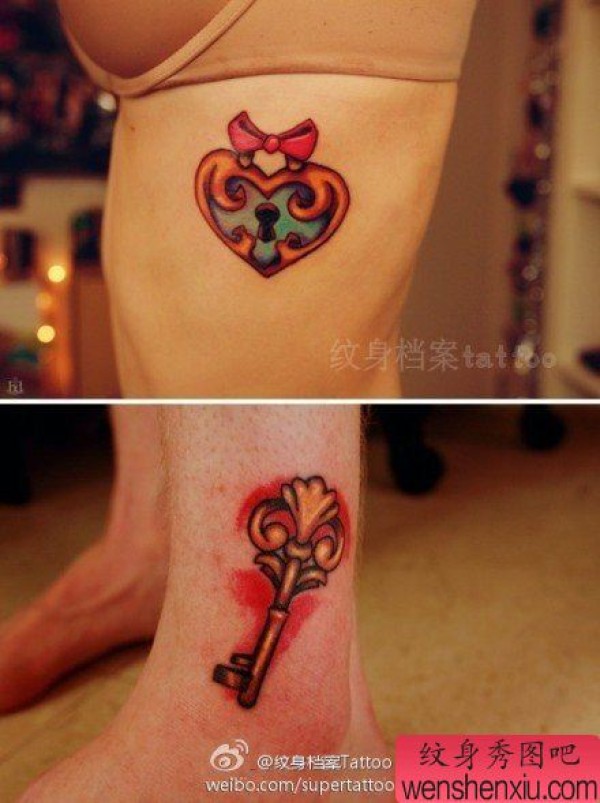 一张时尚好看的情侣爱心锁钥匙纹身图案