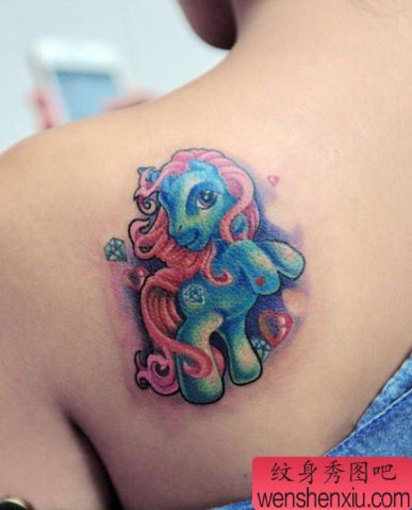 美女肩背卡通独角兽纹身图案
