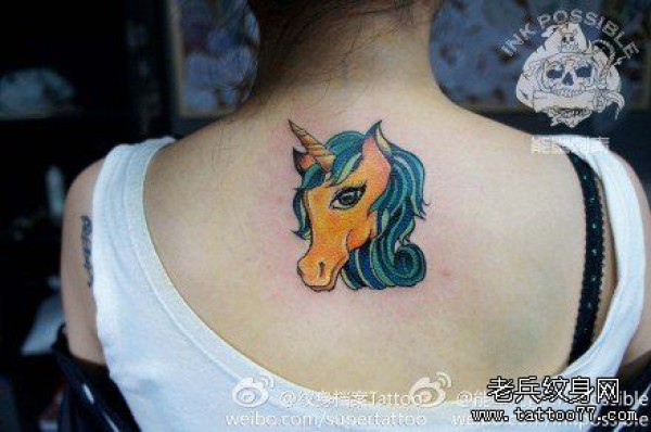 女生背部卡通独角兽纹身图案
