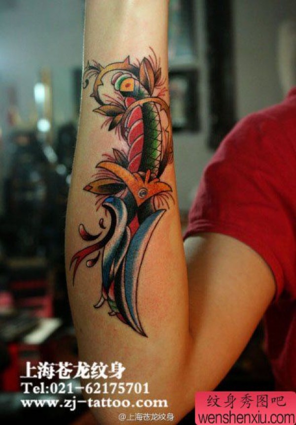 女生手臂一张匕首纹身图案