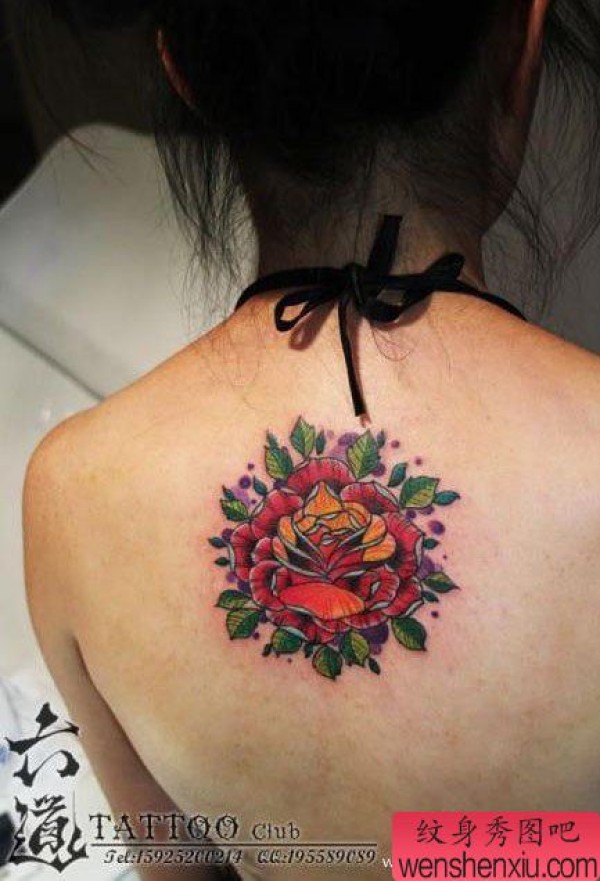 美女背部漂亮的欧美风格玫瑰花纹身图案