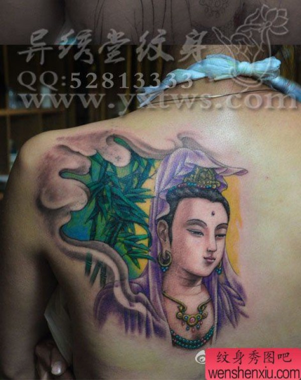 背部好看的彩色观音纹身图案