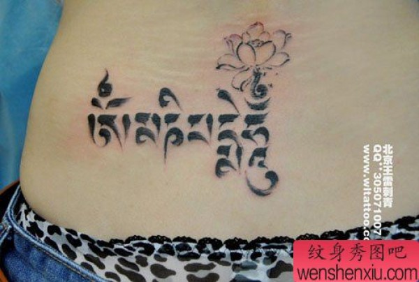 美女腰部精美时尚的梵文与莲花纹身图案