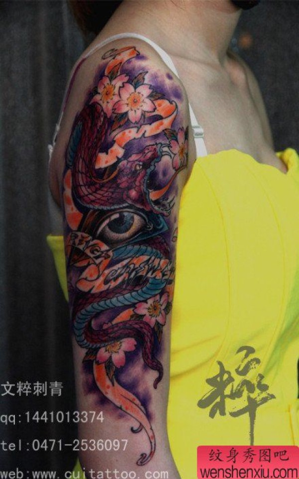 美女手臂好看的彩色蛇纹身图案