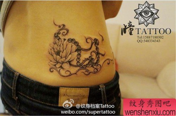 美女腰部唯美好看的莲花与佛珠纹身图案