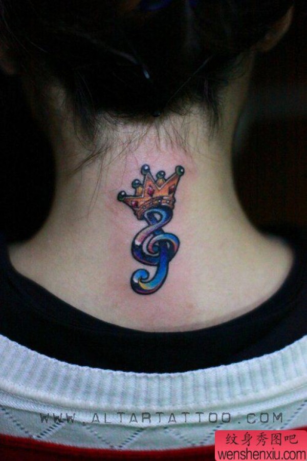 女生颈部音符与皇冠纹身图案