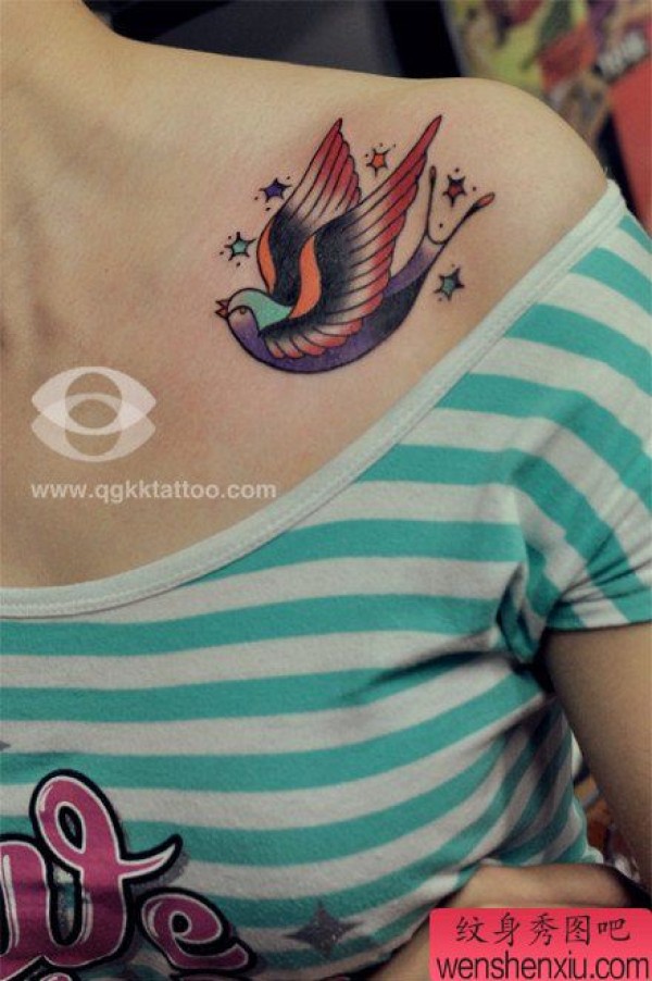 女生肩膀处彩色小燕子纹身图案