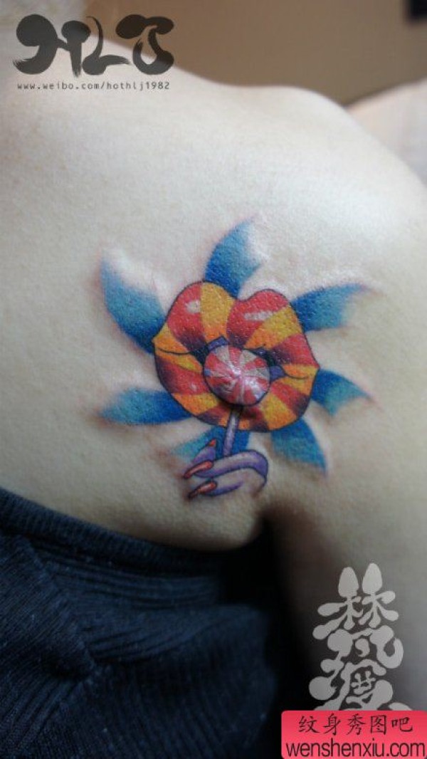 女生肩背唇印与棒棒糖纹身图案