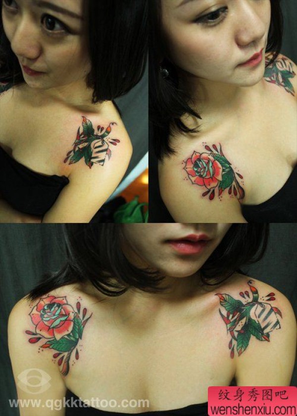 美女肩膀处漂亮的玫瑰花纹身图案