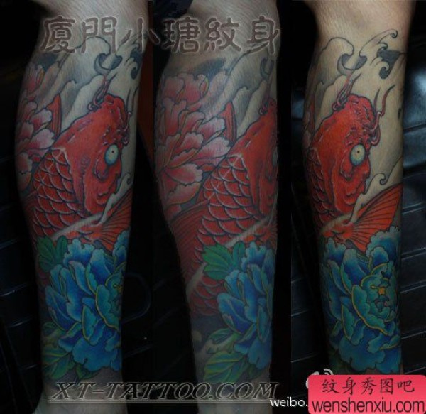 腿部经典的传统鲤鱼牡丹纹身图案