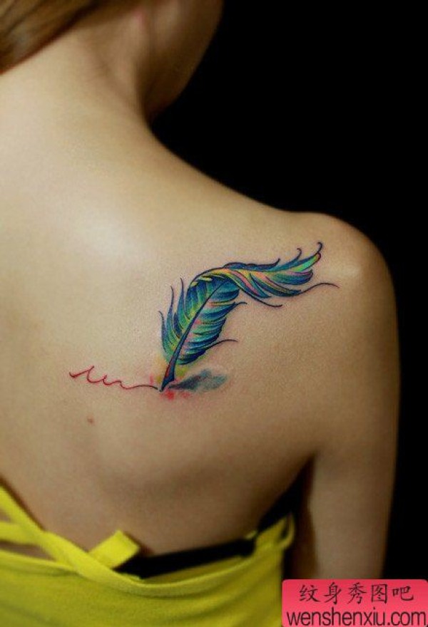 美女肩背漂亮的彩色羽毛纹身图案