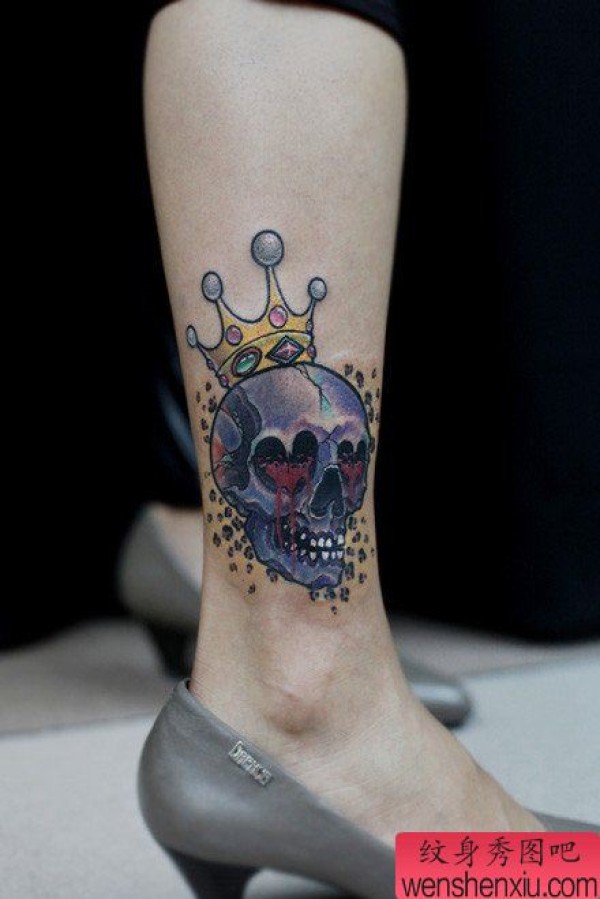 女生腿部好看的彩色骷髅与皇冠纹身图案