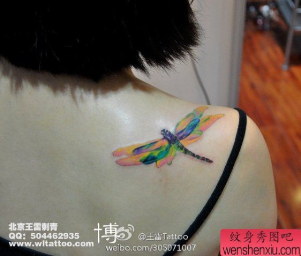 女生肩背漂亮的彩色小蜻蜓纹身图案
