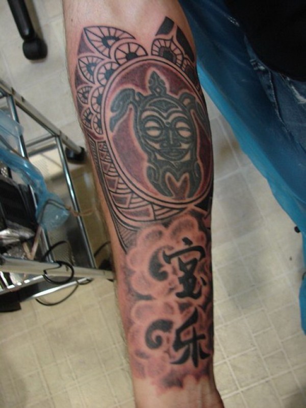 手臂红色雾图腾汉字纹身组合