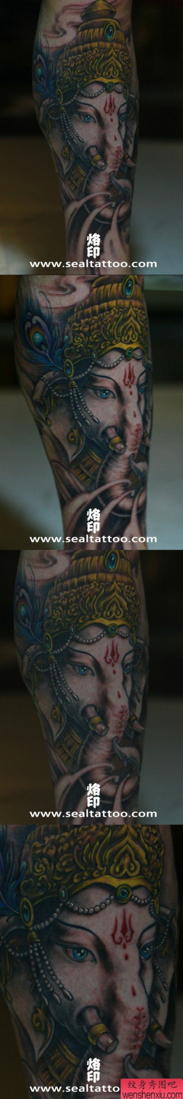 男士腿部经典的象神纹身图案