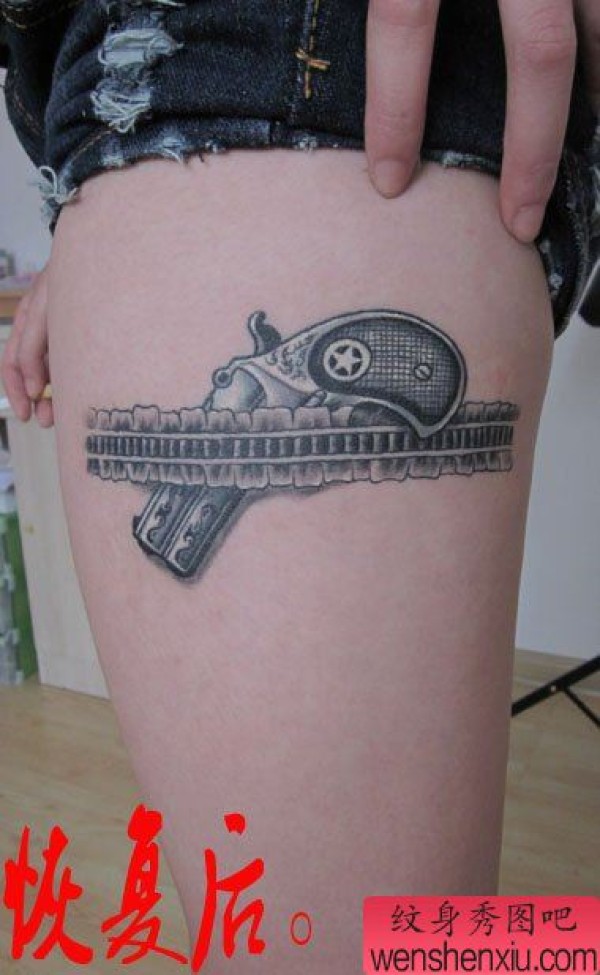 女生腿部简单时尚的蕾丝手枪纹身图案