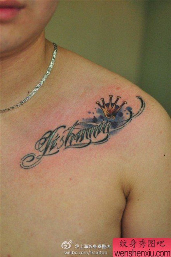 男士锁骨处好看的字母与皇冠纹身图案