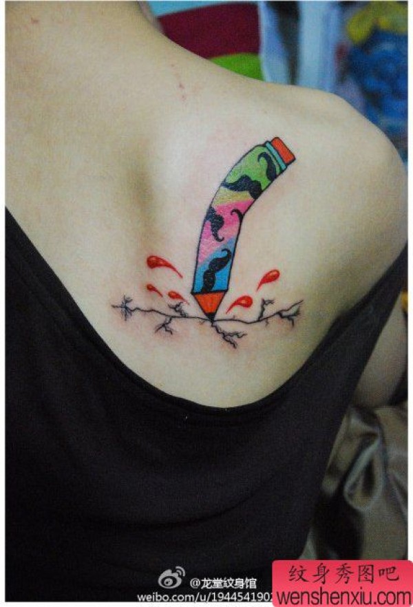 女孩子肩背彩色铅笔纹身图案
